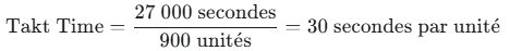 Interprétation : L’usine doit produire une unité toutes les 30 secondes pour satisfaire la demande client sans générer de stock superflu (Muda).